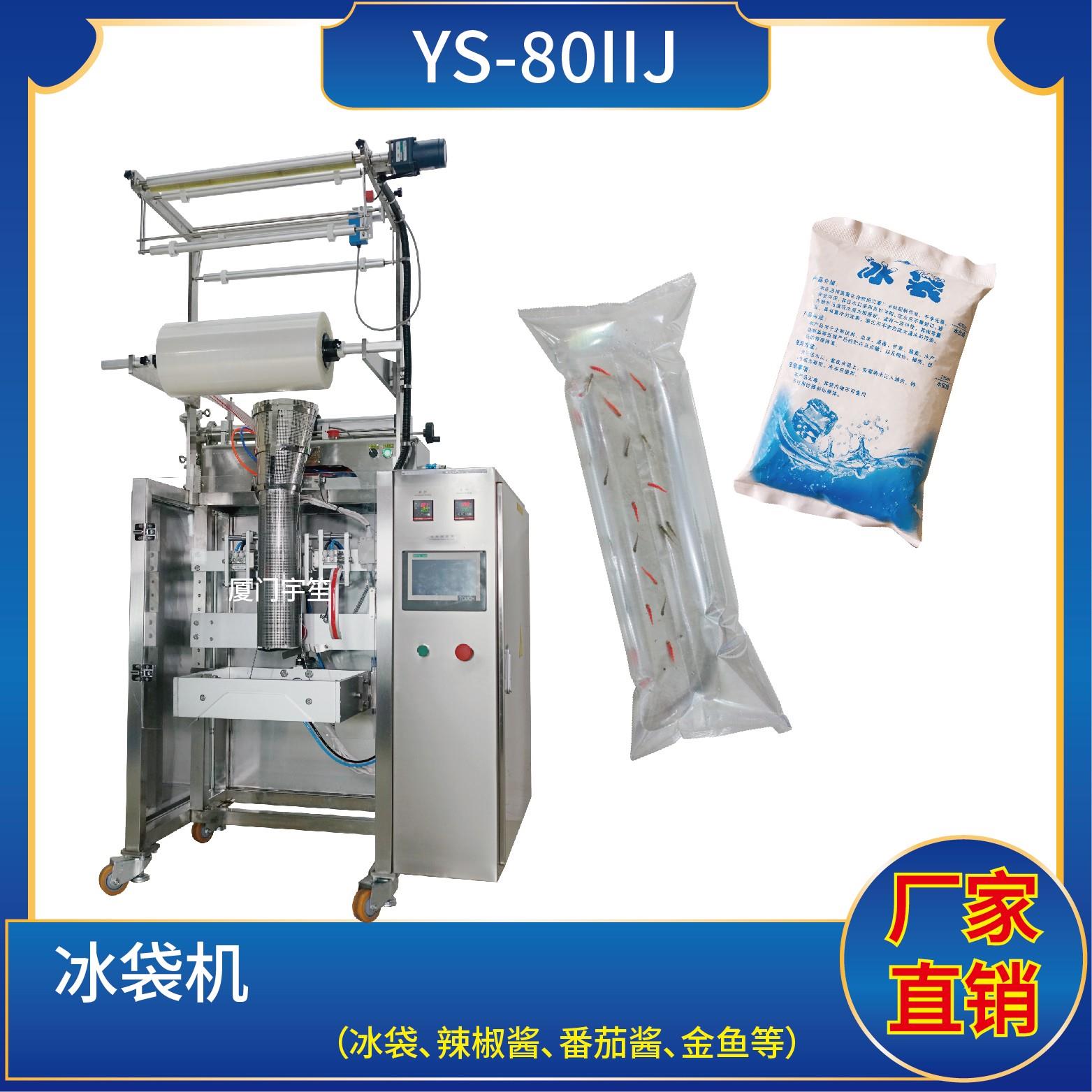 YS- 80IIBJ 冰袋機特 點 1、適用于食品、醫(yī)藥、化工、化妝品行業(yè)中顆粒、粉劑、液體、醬料等物品的計量包裝。2、可自動完成制袋、計量、下料、封合、分切、計數,可根據客戶要求配置打印批號等功能。3、觸摸屏操作,PLC控制,伺服電機控制袋長,性能穩(wěn)定、調整方便、檢測準確。智能式溫控儀,PID調節(jié),保證將溫度的誤差控制…